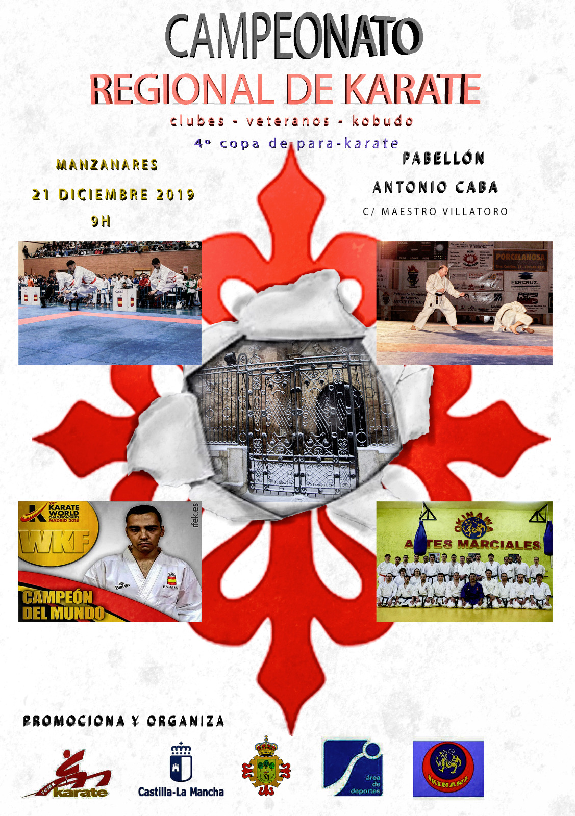 21.2019 Cto.CLM Clubes, Veteranos y Kobudo y IV Copa CLM Para-Karate. DISPOSICION CLUBES Y VETERANOS 2019 CAMPEONATO DE CASTILLA-LA MANCHA DE CLUBES, VETERANOS Y KOBUDO IV COPA DE CASTILLA-LA MANCHA DE PARA-KARATE FECHA: 21 DE DICIEMBRE DE 2019 HORA: 09’00 Horas Los deportistas deberán estar media hora antes. LUGAR: Manzanares (Ciudad Real) Pabellón Antonio Caba – C/ Maestro Villatoro P R O G R A M A JORNADA DE MAÑANA Comienzo a las 9’00 horas COMPETICIÓN DE CLUBES (EQUIPOS BENJAMIN, ALEVIN, INFANTIL) CAMPEONATO DE KOBUDO JORNADA DE TARDE Comienzo a las 16’00 horas COMPETICIÓN DE CLUBES (EQUIPOS CADETE, JUNIOR SENIOR) COMPETICIÓN DE VETERANOS IV COPA DE CASTILLA-LA MANCHA DE PARA-KARATE
